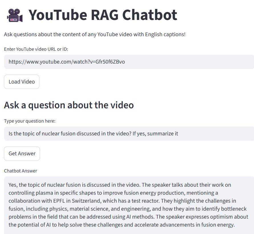 Developed a GenAI-powered YouTube Q&A chatbot using LangChain and RAG architecture. The application converts video transcripts into searchable vector embeddings and delivers precise, context-aware answers via an LLM. Fully deployed with a Streamlit UI - Personal Project